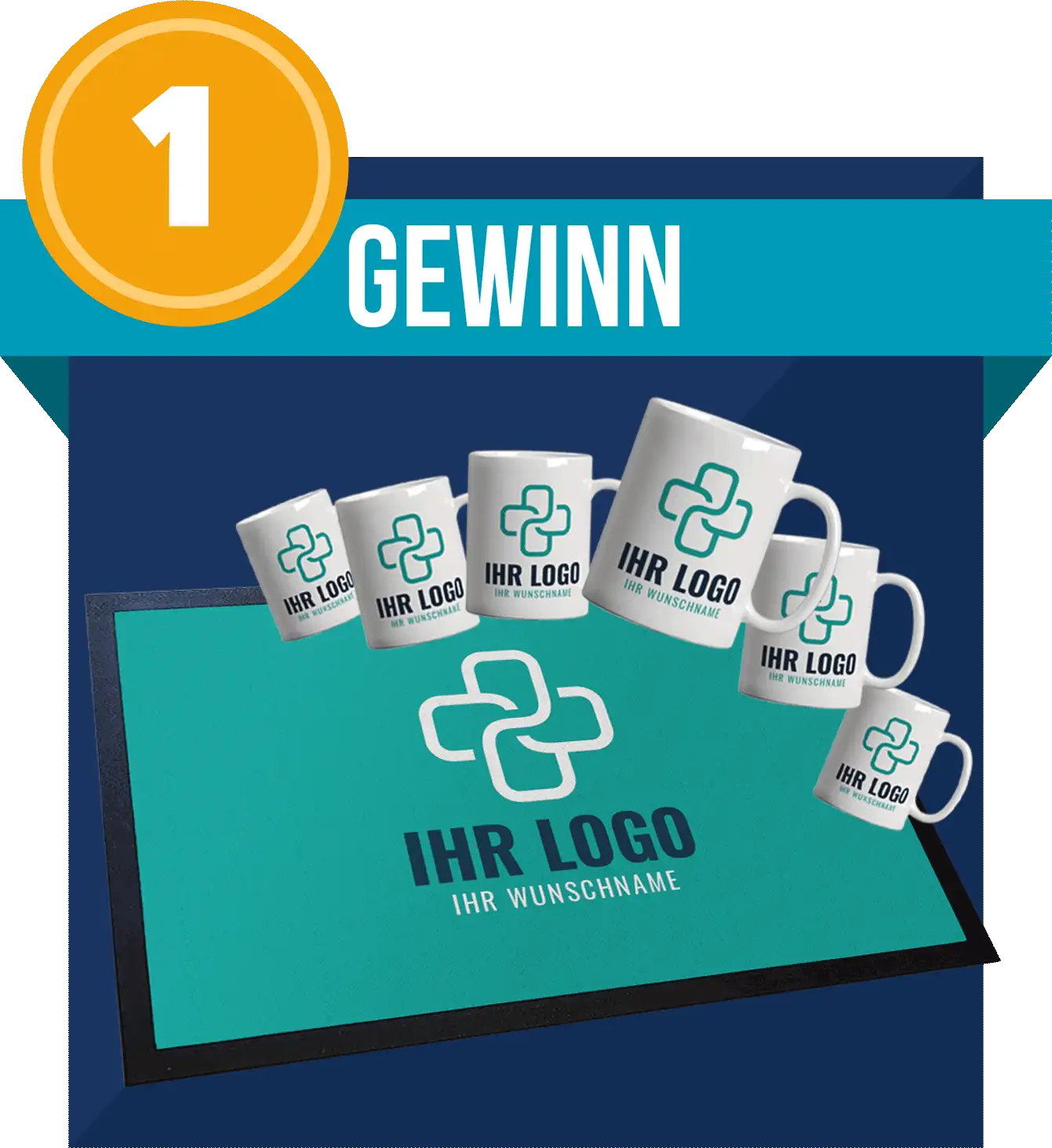 Nutze die Chance und gewinne eine Fußmatte und 6 individuell gestaltete Tassen mit eurem Praxislogo. Als Highlight drucken wir außerdem auf jede Tasse einen Namen aus deinem Praxisteam.